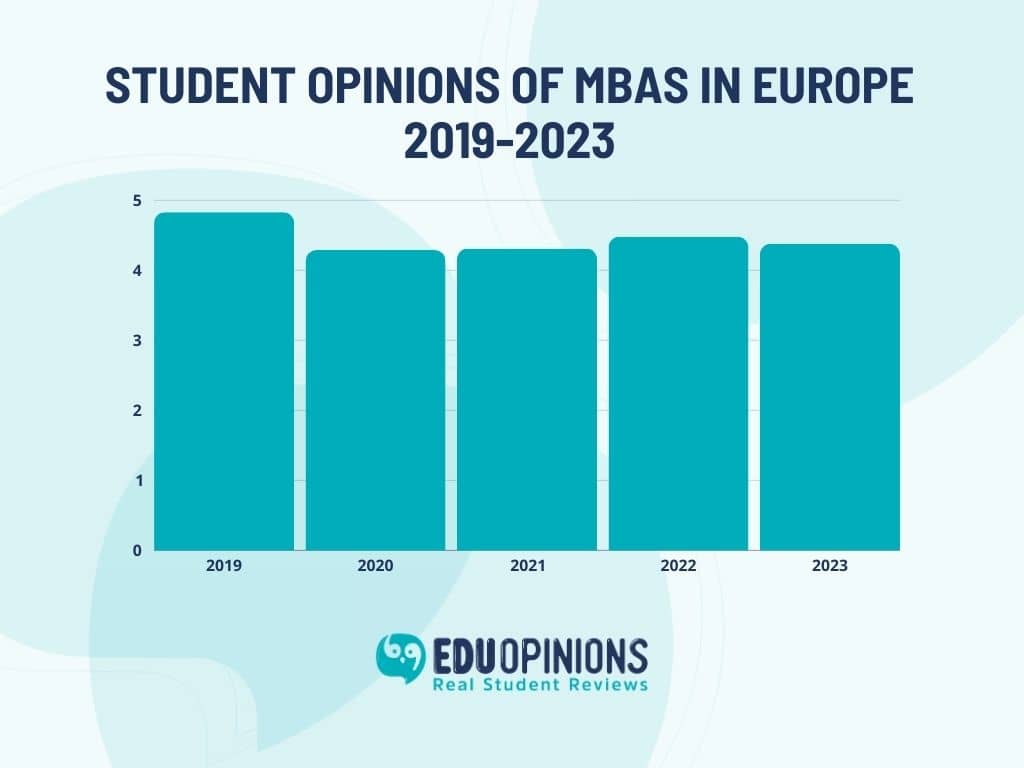 So, we’ve analysed the data from thousands of verified student reviews on EDUopinions to find out what students are saying about their programmes in Europe. We’ve looked at average programme ratings, how things have changed between 2019 and 2023, and which institutions have the highest-rated MBA degrees.